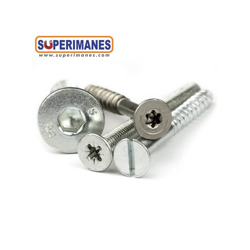Imán para atornillar en lugares donde no hay metal y no tienes posibilidad de usar su campo magnético. Estos tipos de imanes son muy usados en carpinterias, ferias, comercios, muebles, cerramientos de puertas, cocinas, etc.